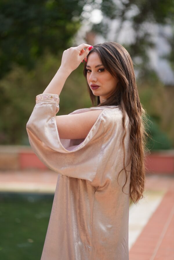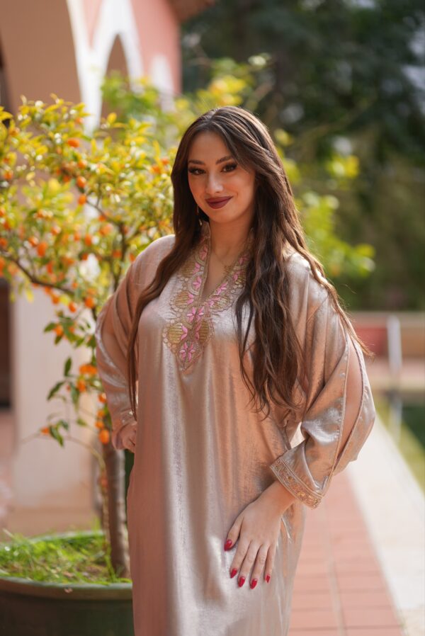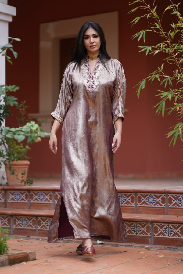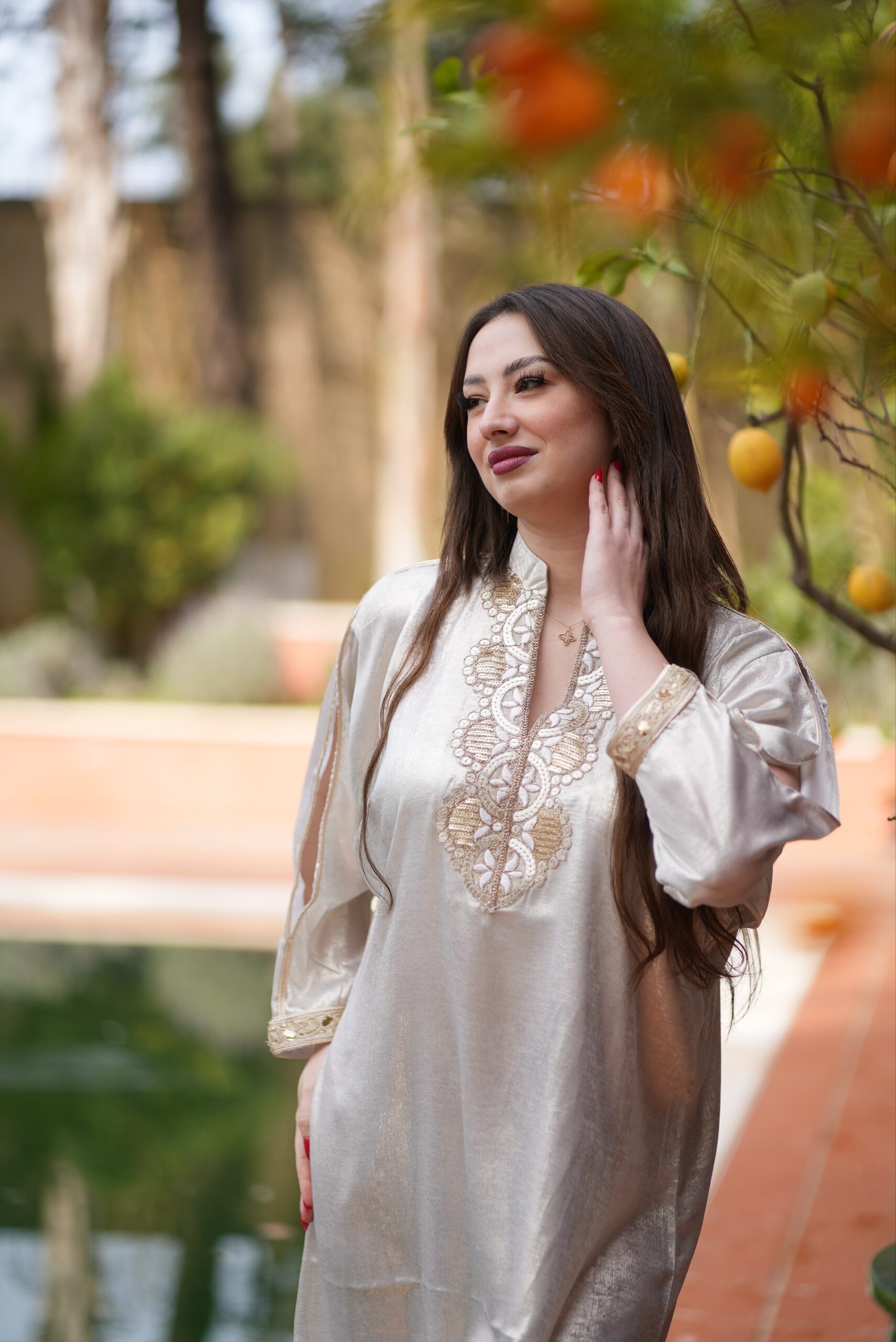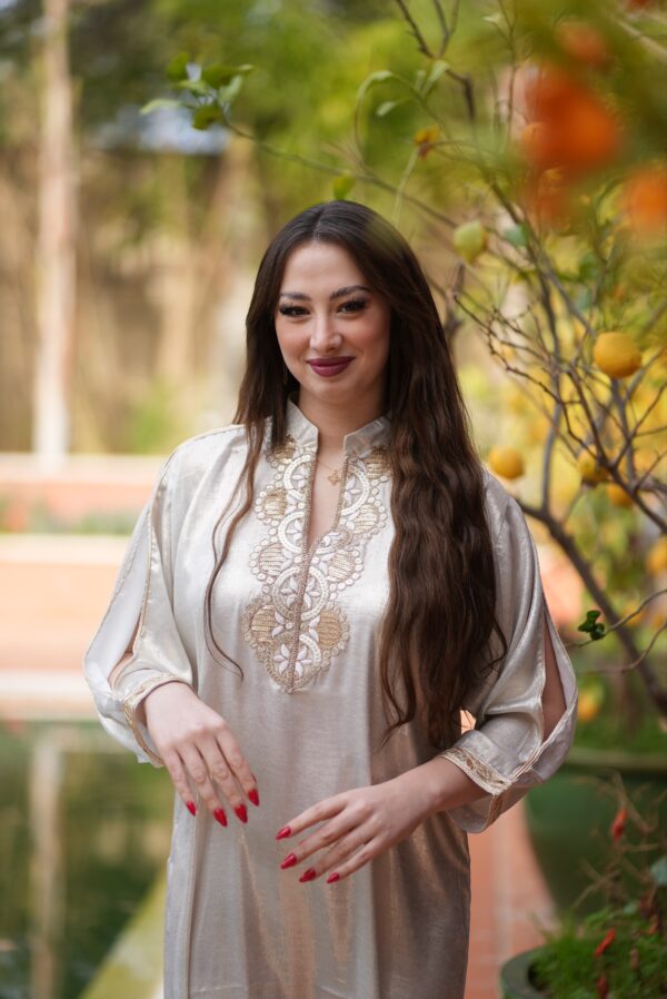 Magnifique robe au col officier, délicatement ornée de galon brodé et de strass au niveau du col et des manches. Les fentes aux manches ouvertes offrent un rendu élégant et raffiné, sublimé par de somptueuses perles.