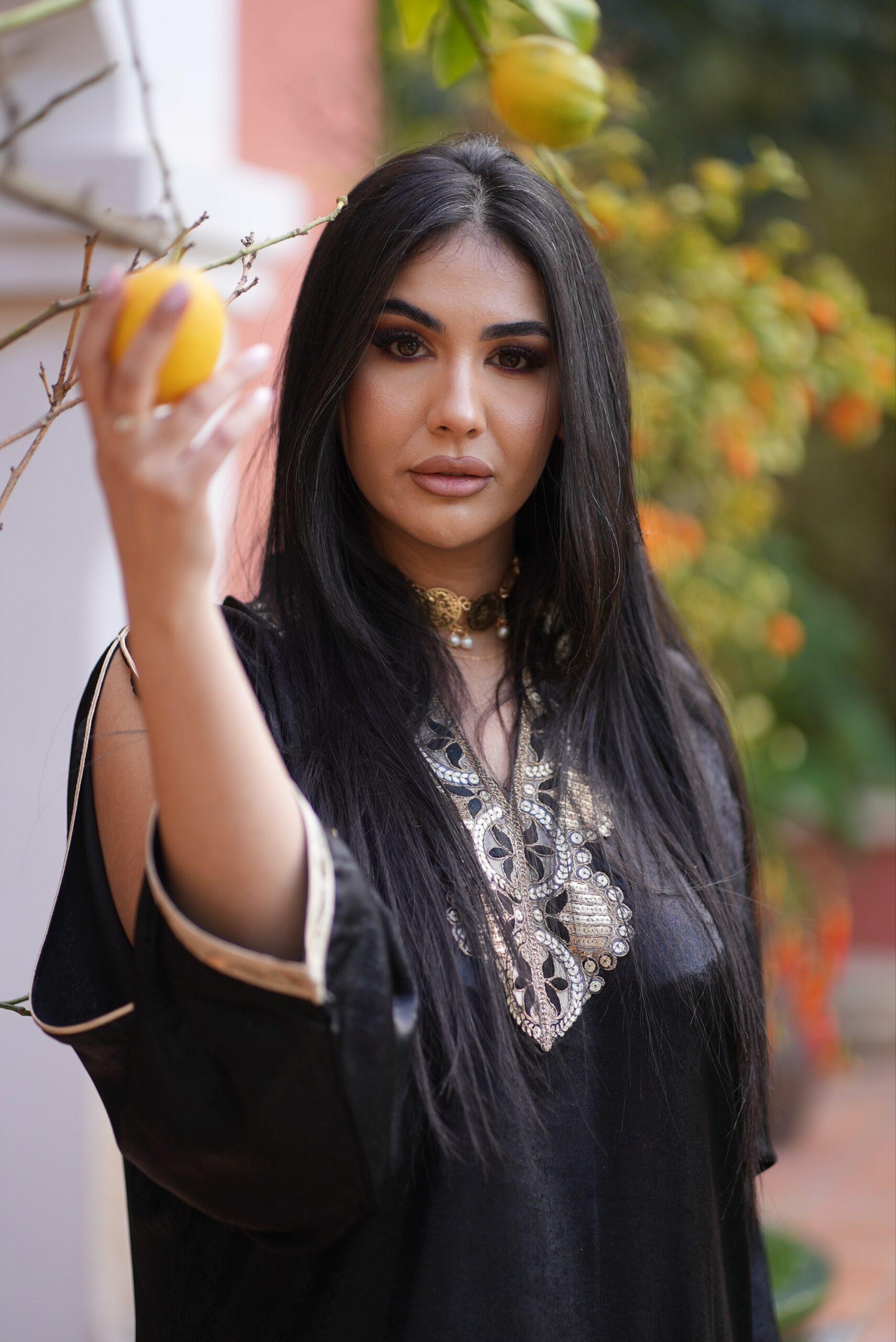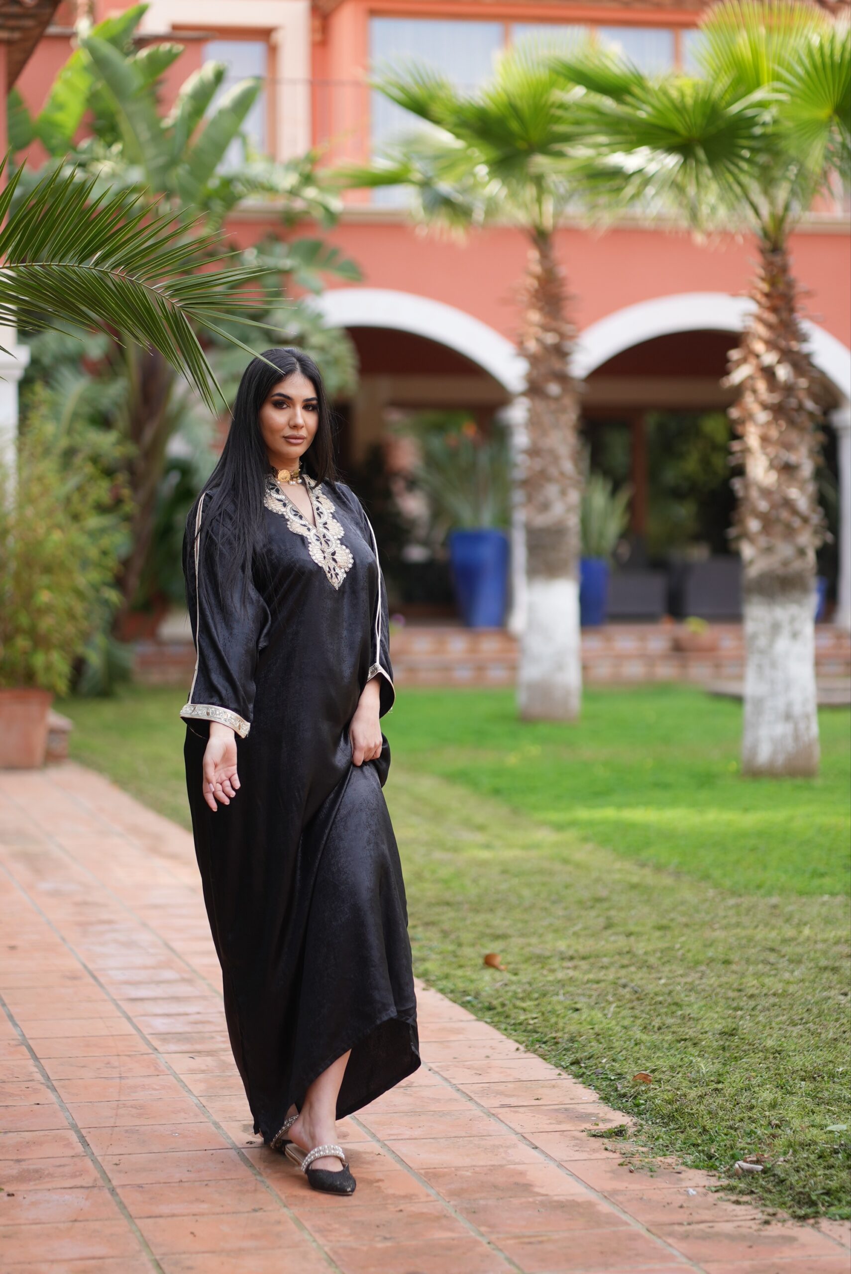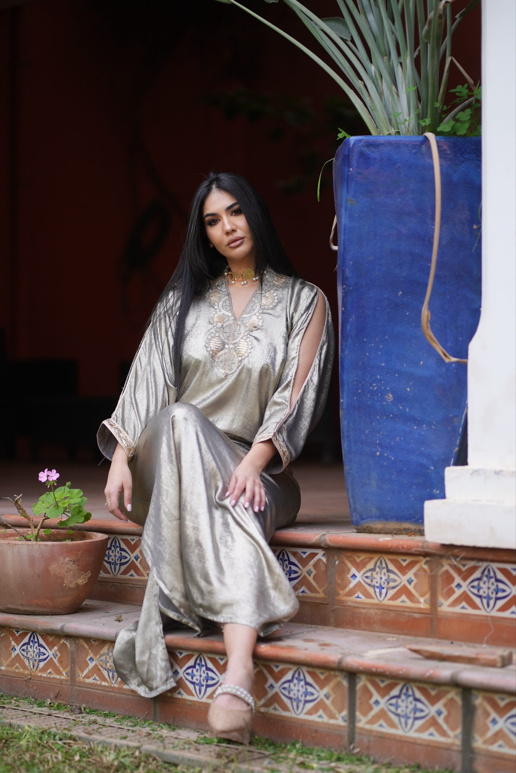 Magnifique robe au col officier, délicatement ornée de galon brodé et de strass au niveau du col et des manches. Les fentes aux manches ouvertes offrent un rendu élégant et raffiné, sublimé par de somptueuses perles.